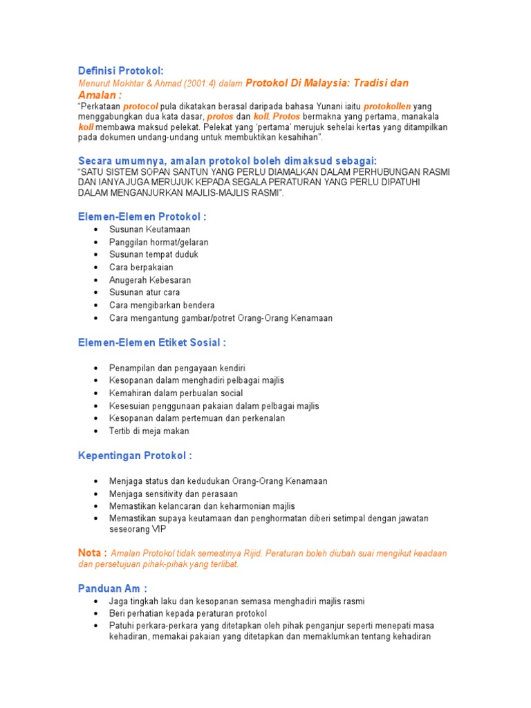 Menjelaskan kepada peserta keperluan dan kepentingan Pengurusan protokol dan etiket sosial. Mempelajari teori dan amali menguruskan majlis serta kemahiran protokol etiket dan. Xi Bismillahirrahmanirrahim Alhamdulillah bersyukur ke hadrat Allah SWT kerana Jabatan Bahasa dan Komunikasi telah berjaya menghasilkan sebuah buku iaitu Protokol dan Etiket.